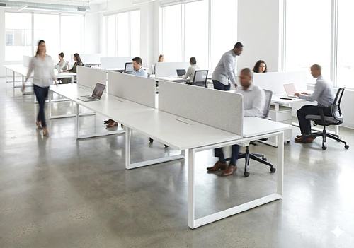 Первый бум open-space пришёл с идеей «командной работы». Стены ушли, столы на 8–10 человек — экономия 30 % пространства. Но по данным Steelcase (1998), шум и отсутствие приватности снижали концентрацию на 25 %.
