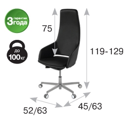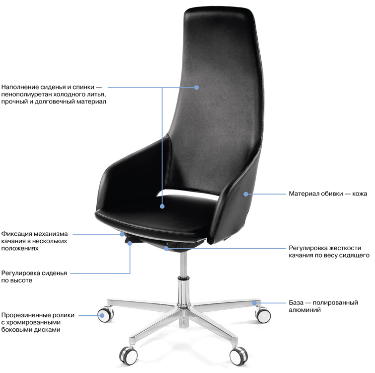 Кресло Captain в складском ассортименте представлено в черной коже, на полированной металлической базе с колесами для твердых покрытий. Кресло снабжено механизмом качания с возможностью фиксации в нескольких положениях, регулировкой сиденья по высоте и регулировкой жесткости качания по весу сидящего.