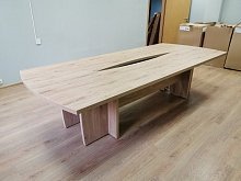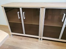 Комплектация: интересны квадратные регулируемые опоры шкафов. Комплектация шкафов возможна на единой базе с общим топом с всевозможными дверьми (ЛДСП, обычное тонированное стекло, матовое тонированное стекло в алюминиевой раме). Предлагаются наборные переговорные столы, размеры которых ограничены только фантазией клиента.