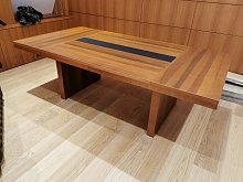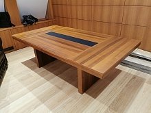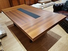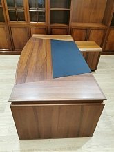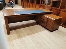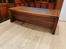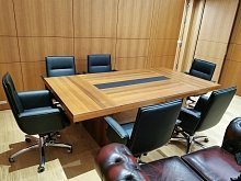 Престиж, представительность и дополнительный комфорт вносят специальные квадратные столы для переговоров 130х130см,  а также прямоугольные столы 230х120 см или 340х120 см. Столы для переговоров позволят проводить в ультрасовременном, но вовсе невычурном и крайне стильном кабинете руководителя эффективные совещания, собрания и встречи. Столешница рабочего стола руководителя из массива дерева с изумительной кожаной вставкой обработана шпонированным покрытием, имеет панель толщиной в 19 мм. Опоры выполнены из тамбурата толщиной 90 мм.