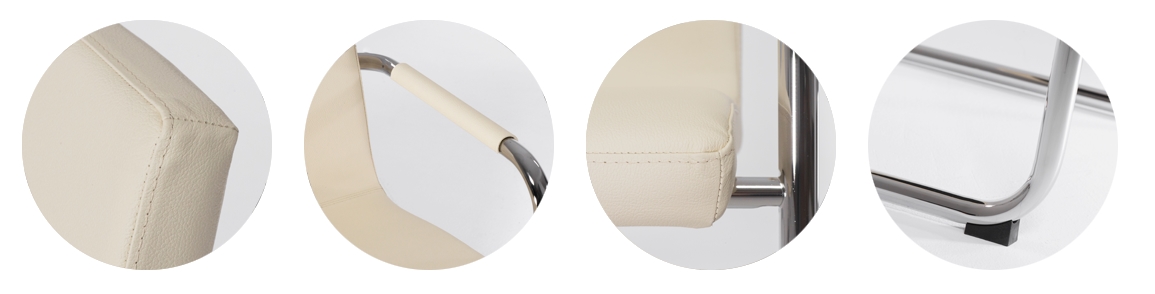 Материал обивки каркаса кресла и накладок на подлокотники — сплит-кожа бежевого цвета. Стальная хромированная база выдерживает нагрузку до 95 кг.
