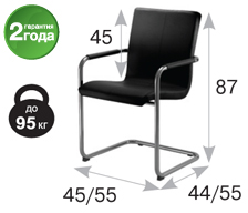 Материал обивки каркаса кресла и накладок на подлокотники — экокожа черного цвета. Стальная хромированная база выдерживает нагрузку до 95 кг.