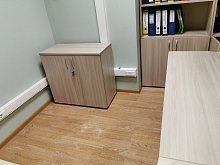 – «светло-серый» с «тёмно-серым»: в цвете «тёмно-серый» выполнены основания столов, корпуса тумб и шкафов. Приставки, топы тумб и экраны могут быть выполнены из ЛДСП в цвете «небесный». Окантовка деталей — кромочной лентой цвета «тёмно-серый».
