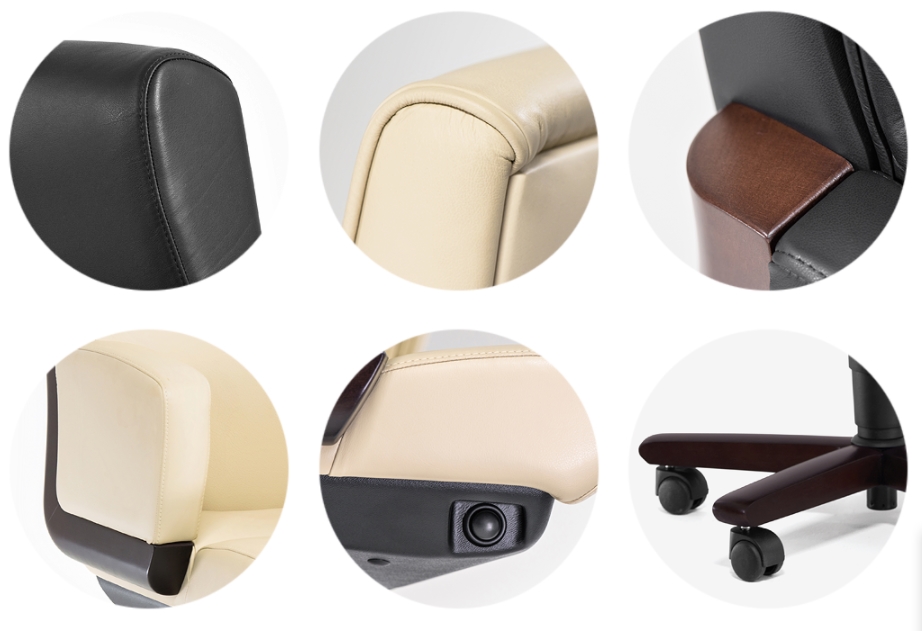 Складские модели Dico представлены в черной и бежевой коже, c фиксированными подлокотниками, обитыми кожей, на крестовине с деревянными накладками в цветах венге и орех. В набор опций включены механизм качания с возможностью фиксации, регулировка жесткости по весу сидящего и регулировка по высоте.