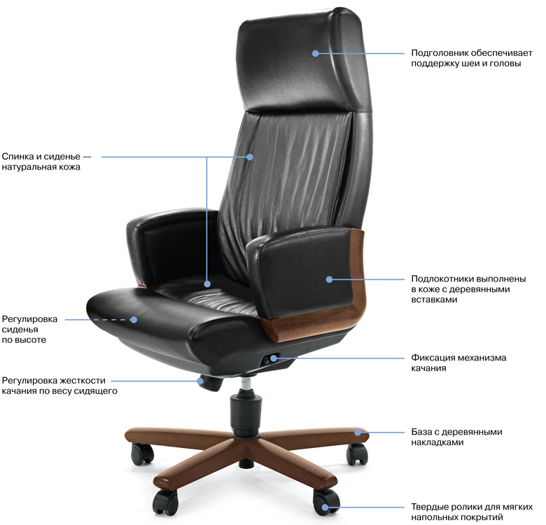 Dico — кресло, предназначенное для солидных классических кабинетов. Конструкция и форма мягких обитых подлокотников со вставками из массива дерева перекликаются с основательностью крестовины, а большой подголовник является логичный завершением образа широкого комфортного сиденья. Настройка высоты сиденья и кнопка фиксации механизма качания компактно встроены в каркас. Каждая деталь имеет значение и подчеркивает солидность кожаного кресла Dico.