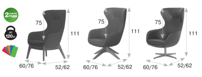 Варианты базы: металлическая крутящаяся для кресла в черной коже, деревянная крутящаяся или деревянные фиксированные опоры для кресла в сером войлоке.