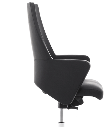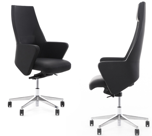 Кресло выполнено полностью в черной коже. База — полированный алюминий с колесами для мягких напольных покрытий.