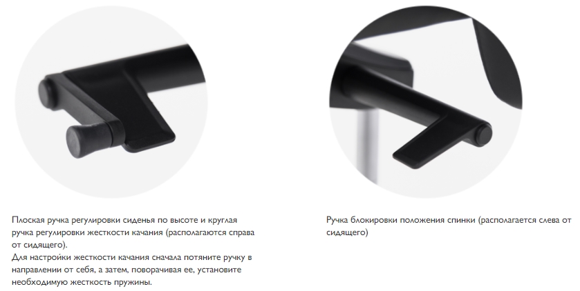Устройство, изменяющее положение кресла за счет смещения центра тяжести сидящего. Фиксация спинки возможна в четырех положениях.