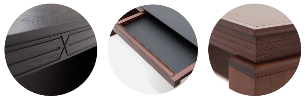 В столешницу интегрирован выдвижной ящик для канцелярских товаров. Фасад ящика изготовлен из массива дерева и имеет U-образное фрезерованное углубление для открывания. Дно ящика инкрустировано натуральной кожей черного цвета.