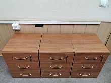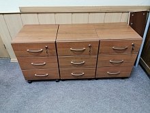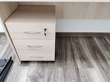- Тумбы шириной 40,7 см с выдвижными ящиками на простых роликовых направляющих, имеющие один из ящиков на замке. Сюда входят приставные, соответствующие высоте стола, и низкая подкатная тумбочка.