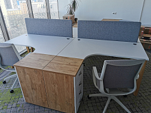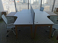 Все рабочие станции ONIX WOOD представляют собой попарно соединённые по длине столешницы (сотрудники располагаются лицом друг к другу) на общем каркасе. Столешницы есть криволинейные и прямоугольные.