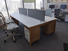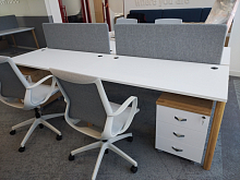 Последние могут соединяться и по ширине, образуя длинные бенч-системы на 4 и 6 рабочих мест. Рассмотрим, какие модели на 4-х человек есть по габаритам (длина всей системы может отличаться, в зависимости от длины 1 столешницы, а ширина предлагается в двух вариантах на выбор).