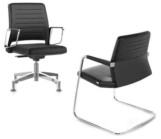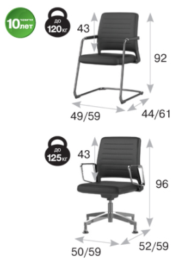 Складской вариант кресла Vintage выполнен в черной кожаной обивке, с кожаными накладками на подлокотниках, на хромированной базе-полозьях с мягкими накладками для твердых полов. Также в складской программе также представлено кресло для руководителя Vintage.