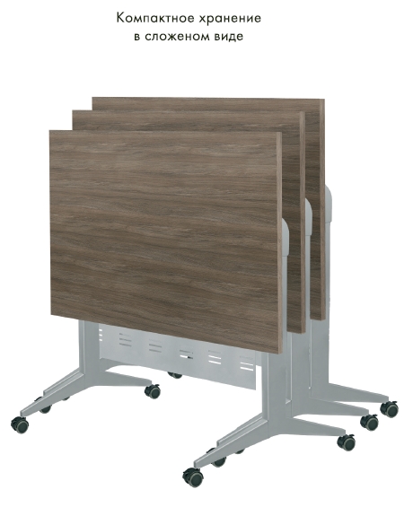 На удобных, прорезиненных роликах, стол свободно перемещается по полу. В сложенном состоянии столы ставятся рядом друг с другом и хранятся, занимая совсем немного места.
